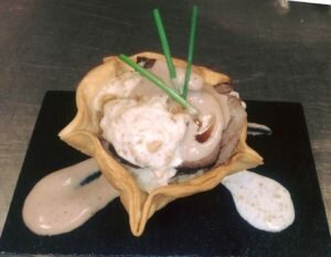 Terraza La Barqueta con su tapa “Canastilla de carrillera cerdo ibérico y puré rustico con salsa de foie y almendras”.